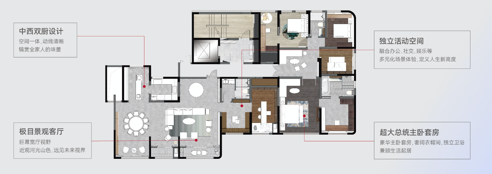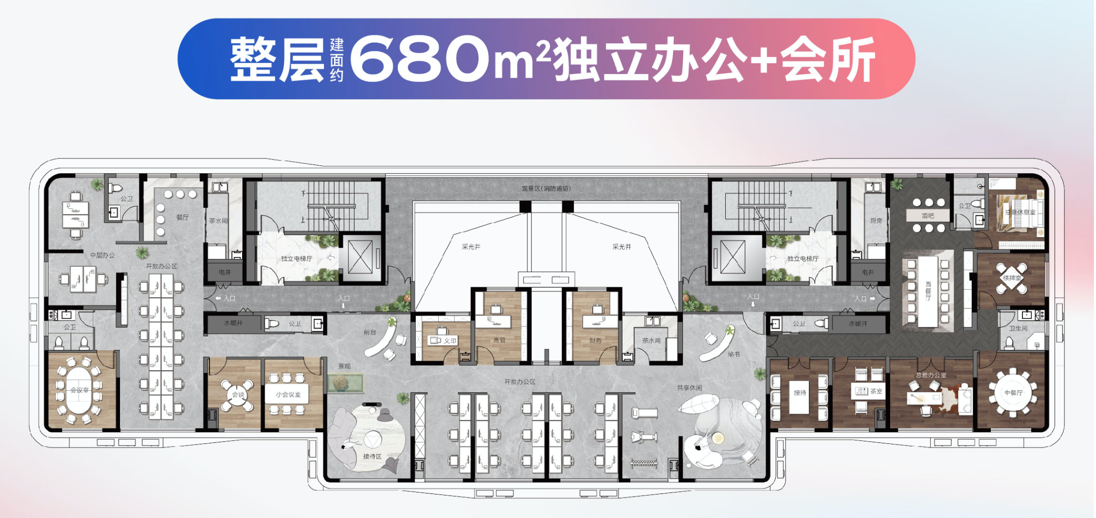 整层680㎡,双电梯入户,南北通透。2.5m/s高速电梯,双气入户。