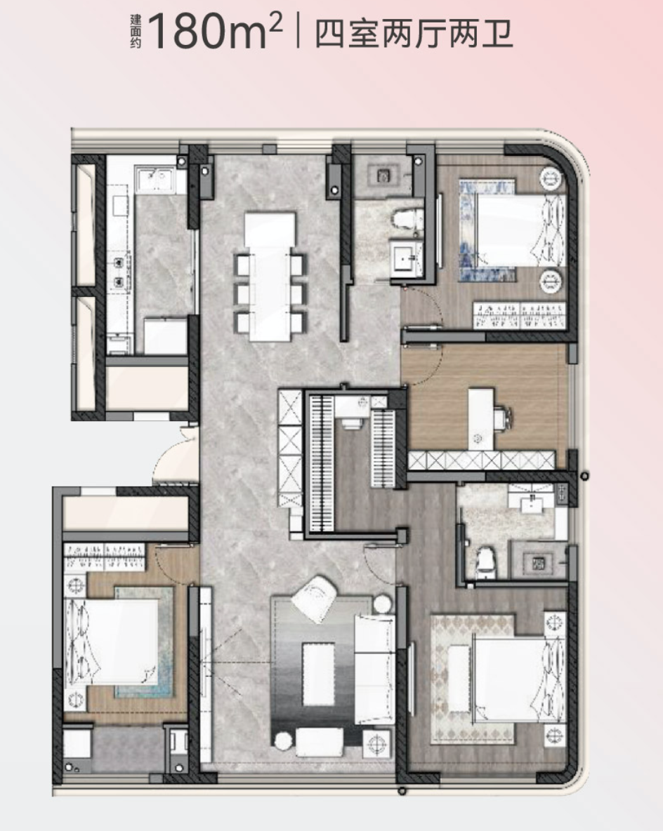 东西边户,四室两厅两卫设计,大北通透大面宽,配有中西双厨设计,全屋明卫。主卧带独立卫生间,衣帽间。