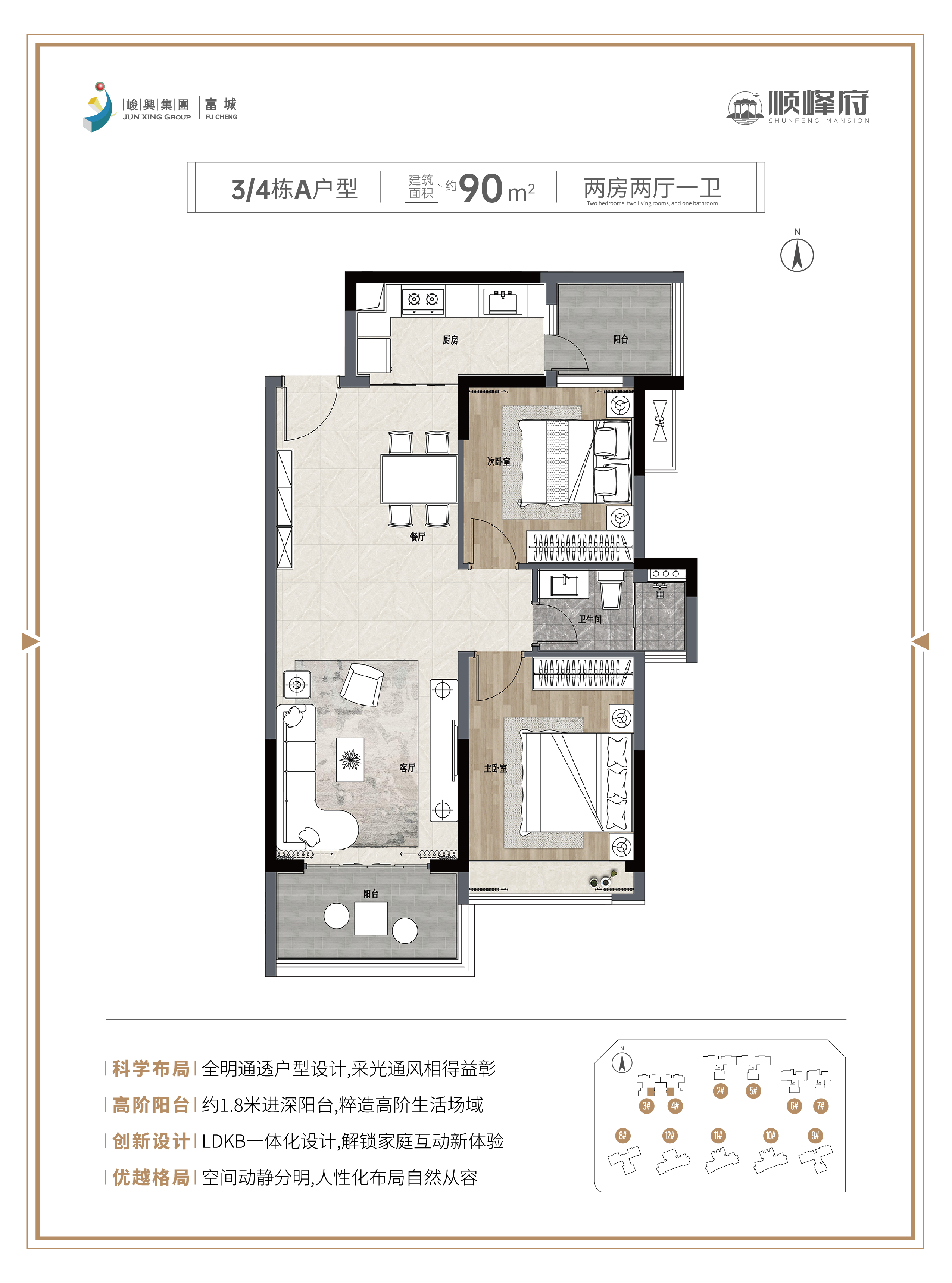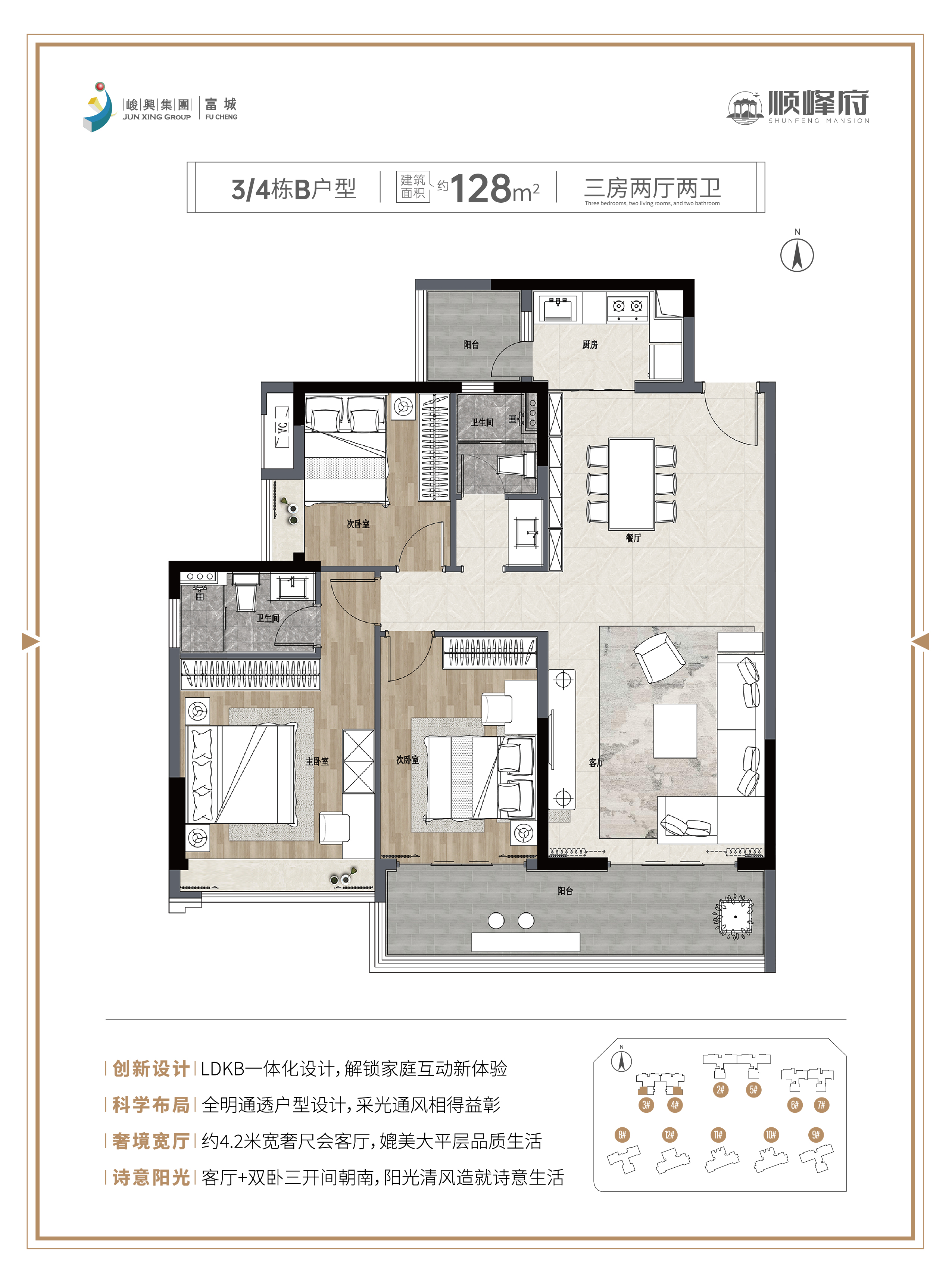 ①科学布局:全明通透户型设计,采光通风相得益彰。 ②高阶阳台:约1.8米进深阳台,粹造高阶生活场域。 ③创新设计:LDKB一体化设计,解锁家庭互动新体验。 ④优越格局:空间动静分明,人性化布局自然从容。