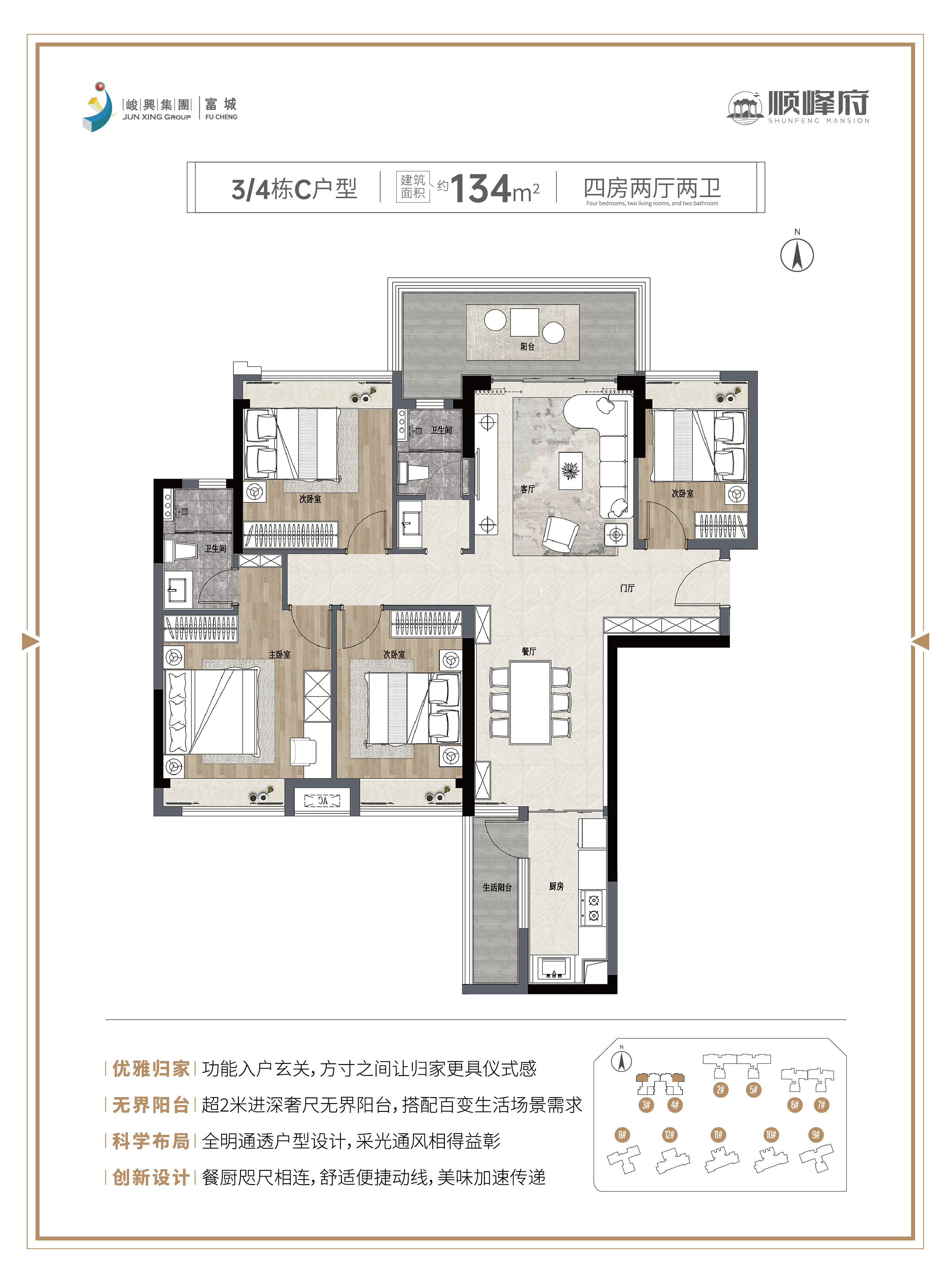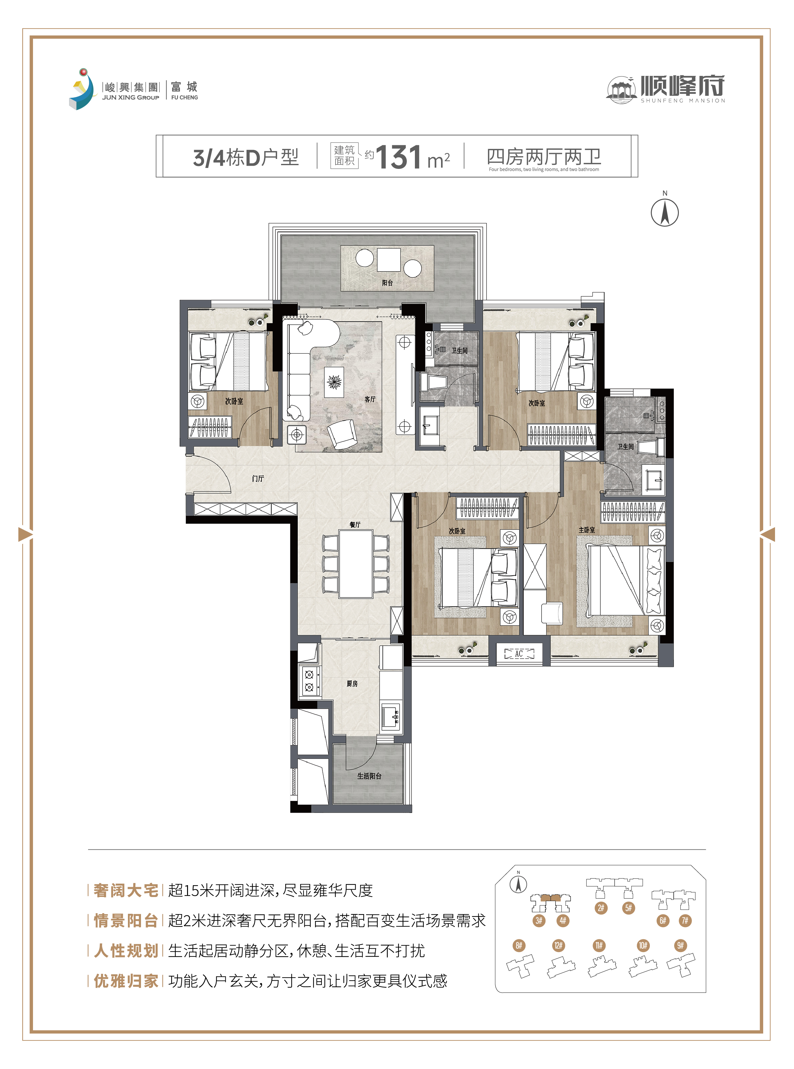 ①奢阔大宅:超15米开阔进深,尽显雍华尺度。 ②情景阳台:超2米进深奢尺无界阳台,搭配百变生活场景需求。 ③人性规划:生活起居动静分区,休憩、生活互不打扰。 ④优雅归家:功能入户玄关,方寸之间让归家更具仪式感。