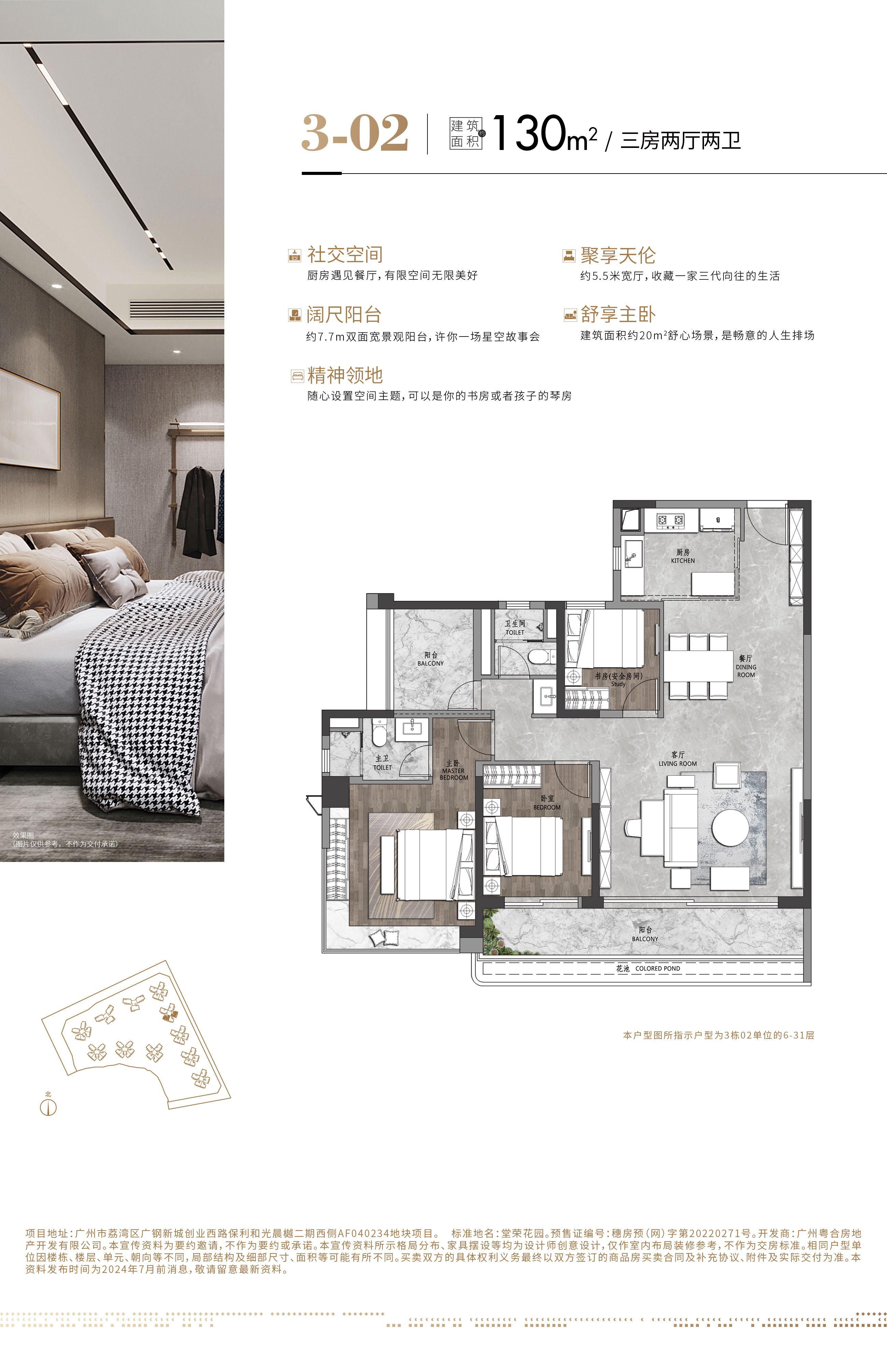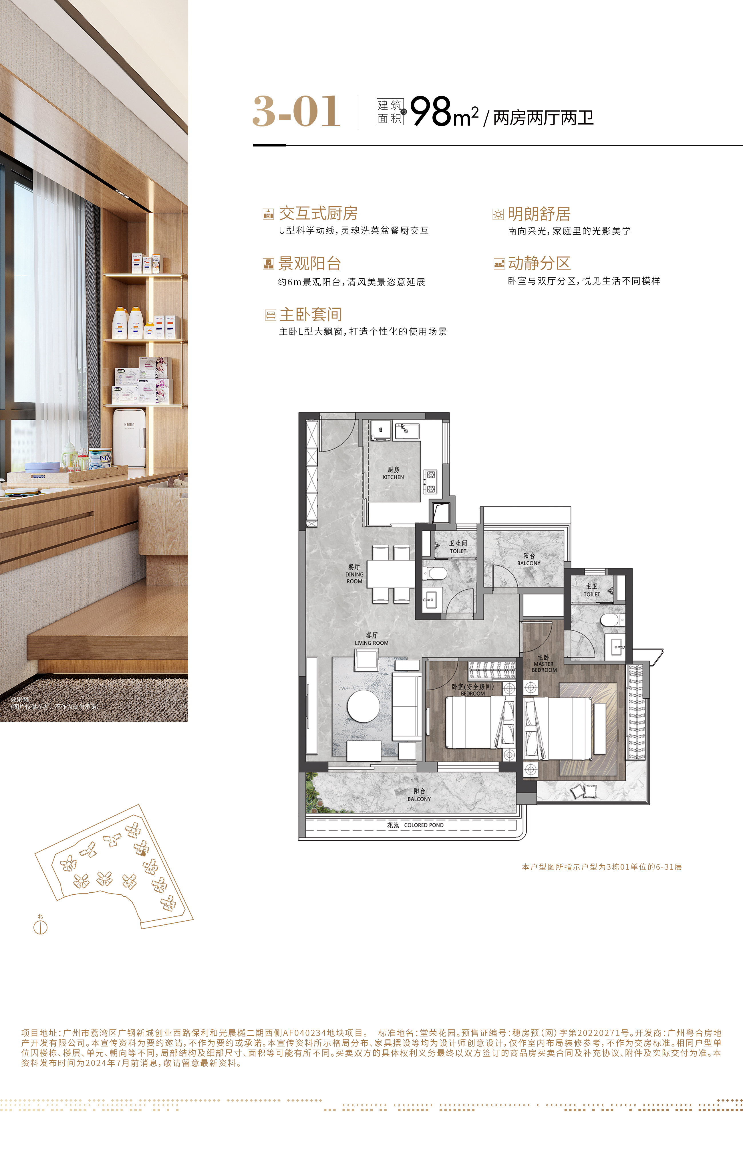 广钢新城CLD 沿江经济宜居大城 广州西部沿江经济带中唯一连片开发的国际中央居住区,政府2年投资1000亿,也是继珠江新城(商业CBD)、白云新城(白云上下大面积低密度别墅区)后政府主导的广州第三大新城(CLD) 双央企联合打造 值得信赖 中海X保利双央企豪宅巅峰收官之作:军工背景雄厚实力央企保利X中海最强产品力,深耕广州多年的双央企龙头霸联合打造,深刻了解广州人民的需求。 家在公园 美景阅尽 前拥世界级4A旅游景区35万㎡广钢中央公园(建设中),左拥花地生态园(规划中),右拥市政公园(规划中);距离中央公园约200米,下楼即享受公园的生活,又能更好的保护隐私,没有人流干扰。 五位立体交通 广州西部C位封面 项目位于广州市荔湾区广钢新城内,6地铁环绕(黄金环城11号线/10号线双线在侧),享广钢新城醇熟配套。 广州第二个教育强区 片区5所省级学校开学 广钢新城规划32所学校,本项目投资配建一所初中、一所高中;项目旁是省实三小已官宣(今年9月开学);另外,省实初中、省实一小、省实二小、华师附幼、小绿堡幼儿园也已开学;226配建的小学也即将开学,届时板块内开学的学校达到九所 五大商圈环伺 悦享大城繁华 西部沿江经济带,5公里内覆盖5商圈,家门口一站式吃喝玩乐购娱应有尽有;下楼即达广钢总部基地大型商业综合体,东与300米地标建筑广船新城为邻,南与广州国际医药港接壤,北临白鹅潭商圈,另外有太古地产加持的聚龙湾总部环绕。 三甲医院+健康医药港 广钢医院改造为三甲医院,五公里范围到达6家三甲医院,一首歌车程到达粤港澳大湾区健康产业集聚地——广州医药港,区域内还规划3家社区医院为您和您家人的健康保驾护航。 4大场景化亮点 提前感知人居生活 1+X客厅的打造满足你对生活的无限想象+交互式厨房打造高级感都市餐厨+270°巨幕飘窗让你以最大视野成就最高视野+超尺度阳台为多场景的使用提供可能性。